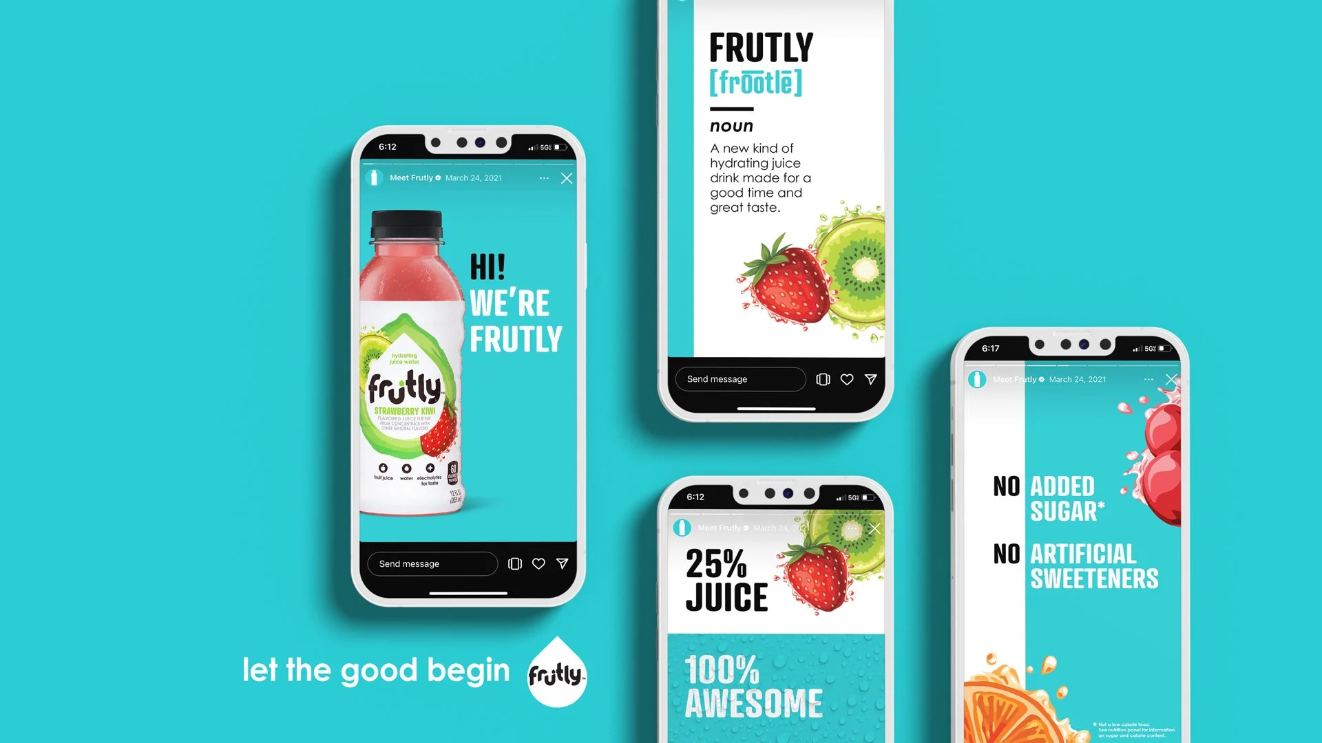 Frutly is a hydrating alternative to normal juice, touting electrolytes, real juice, and hydration. I was part of a team that concepted and created a series of posts to show off these benefits and highlight the playful nature of the product.